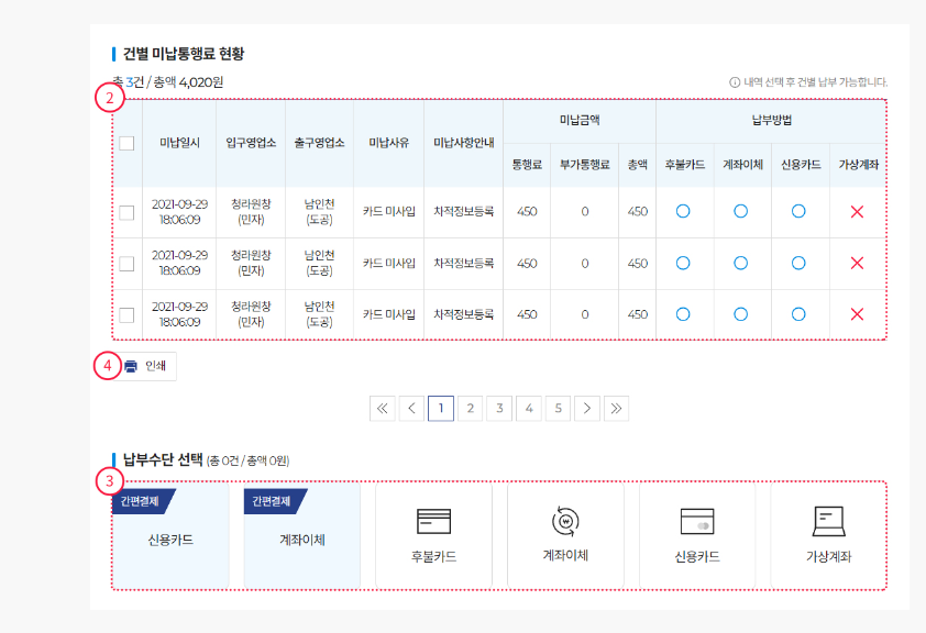 납부수단을 선택하면, 납부수단에 해당하는 팝업이 출력되며, 인쇄 버튼을 선택하면 인쇄 팝업이 열릴고 조회딘 건별 미납통행료를 인쇄할 수 있습니다.