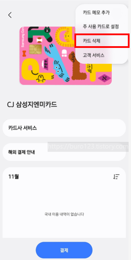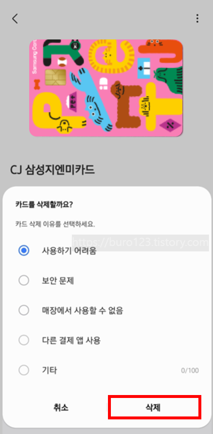 이제 선택한 카드가 삼성페이에서 삭제되어 더 이상 결제에 사용되지 않습니다.