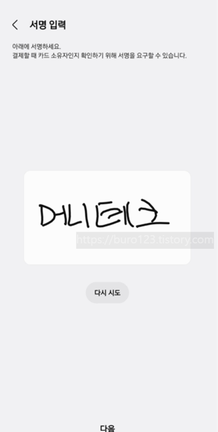 10. 마지막으로 카드 서명을 하고 다음을 누릅니다.