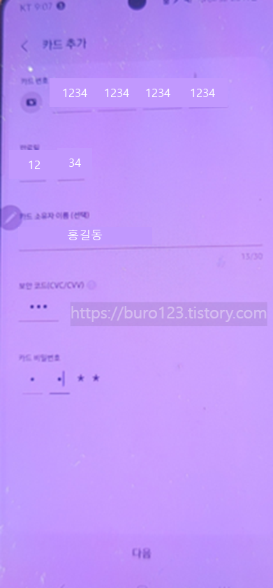 7. 카드 번호가 자동으로 입력된 화면이 나타납니다. 번호에 오류가 있다면 수정이 가능하며, 보안 코드와 카드 비밀번호 앞 두 자리도 입력한 후 다음을 누릅니다.