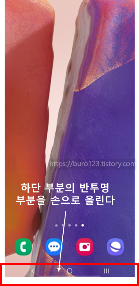 갤럭시 홈 화면의 하단을 보면 작은 네모 모양의 바가 나타납니다. 이 바를 손으로 누른 후 위로 스와이프하여 끌어올립니다.