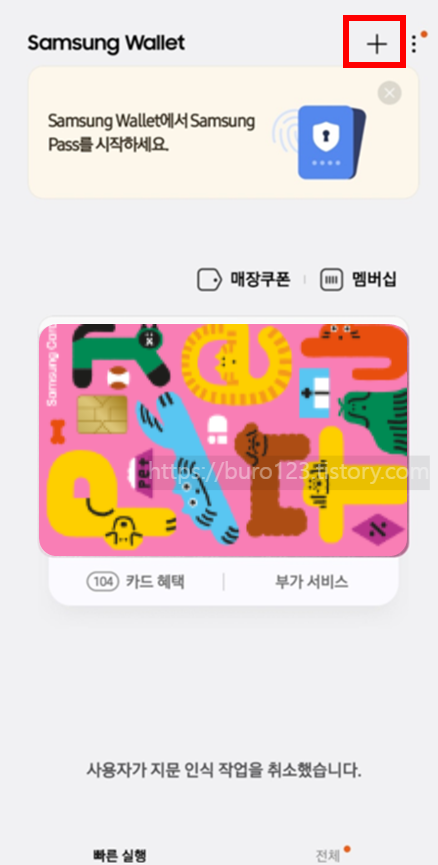 2. 삼성페이 화면의 오른쪽 상단에서 추가 버튼(+)을 누릅니다.