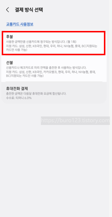 3. 교통카드 회사 목록에서 사용할 교통카드를 선택하세요. (예: T-money, Cashbee 등)