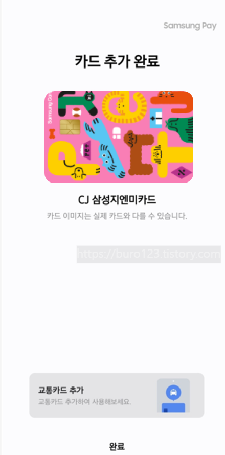 이제 완료 버튼을 눌러 삼성페이의 카드 결제 기능을 자유롭게 이용하실 수 있습니다.