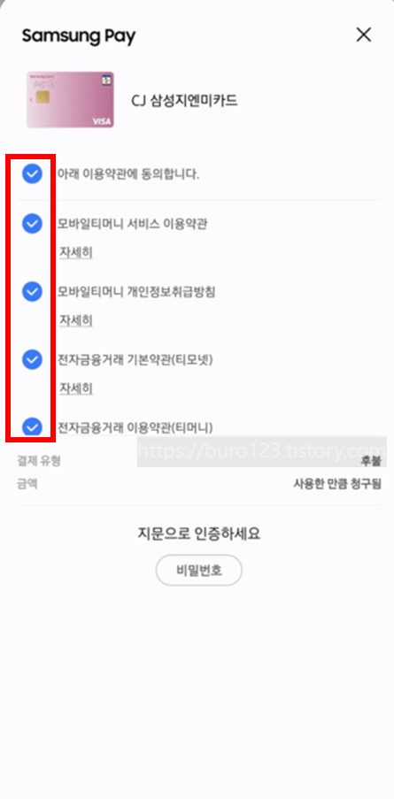 8. 삼성페이 사용을 위해 약관에 동의하는 체크박스를 모두 선택한 뒤, 더 보기를 클릭합니다.