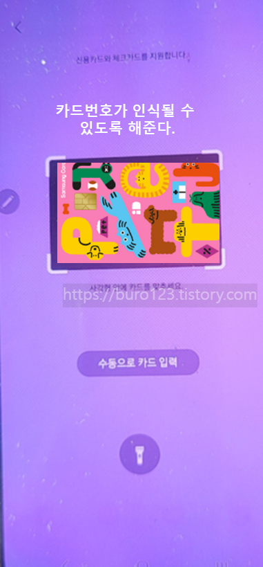 6. 만약 초점이 잘 맞지 않아 인식이 어려우면, 아래의 수동으로 카드 입력 옵션을 선택하여 번호를 직접 입력할 수 있습니다.