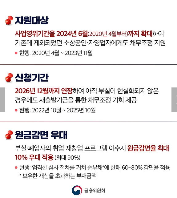 - 중·저신용자를 위한 지역신용보증재단 특례 보증과 브릿지 보증 대상 채무도 이제 조정 대상에 포함됩니다.