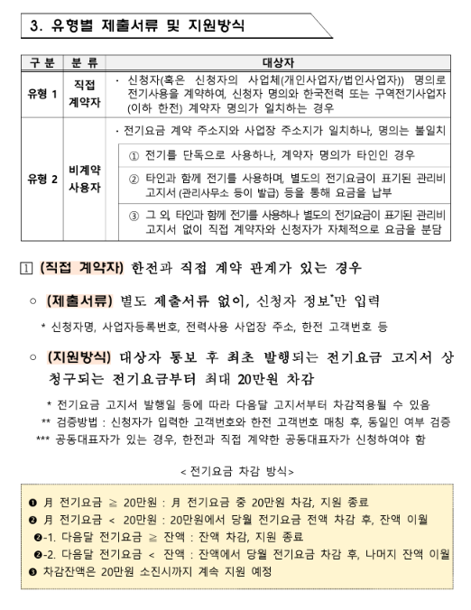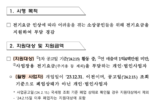 - 전기요금 부담 사업자: 사업장용 전기요금을 부담하는 소상공인으로, 주거용은 제외됩니다.