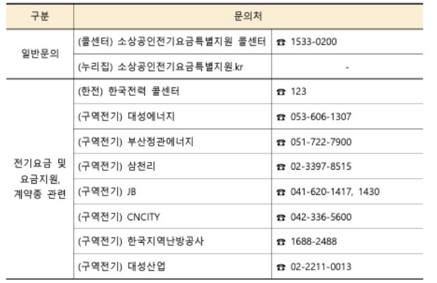 소상공인 전기세 지원 및 차감, 계약종 관련 궁금하신 사항은 한전과(연중무휴) 구역전기사에 문의해 주시기 바랍니다.