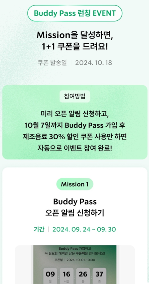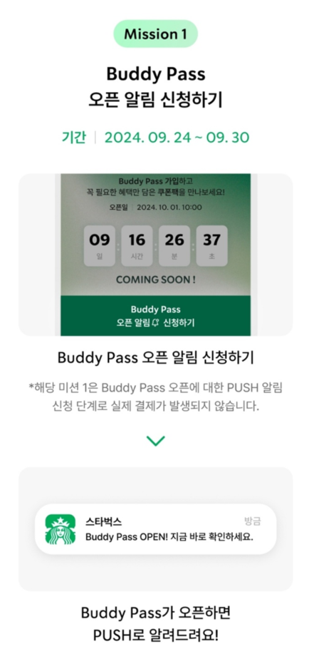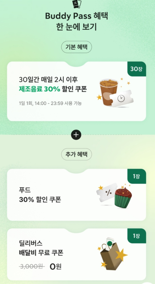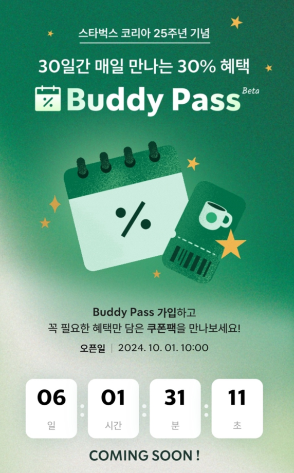 스타벅스의 특별한 혜택을 놓치지 마세요! 미리 오픈 알림을 신청하고 버디패스에 가입하시면, 제조 음료 30% 할인 쿠폰을 받을 수 있으며, 동시에 이벤트에 자동으로 참여됩니다.