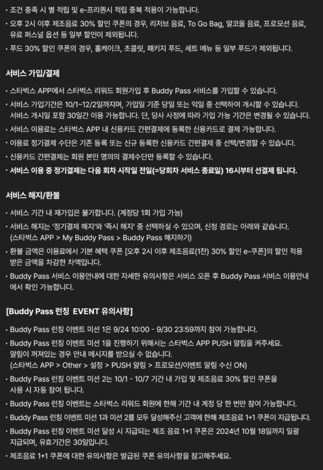 이와 함께, 사전 알림 이벤트도 진행 중입니다. 사전 알림 신청 고객은 구독 서비스 가입 후 음료 할인 쿠폰을 사용할 경우, 추가로 1+1 음료 쿠폰을 받는 특별 혜택을 제공합니다. 이 이벤트는 스타벅스 멤버십 회원들에게 차별화된 혜택을 제공하고, 스타벅스 고객 경험을 한층 풍성하게 만들어줄 것으로 기대됩니다.