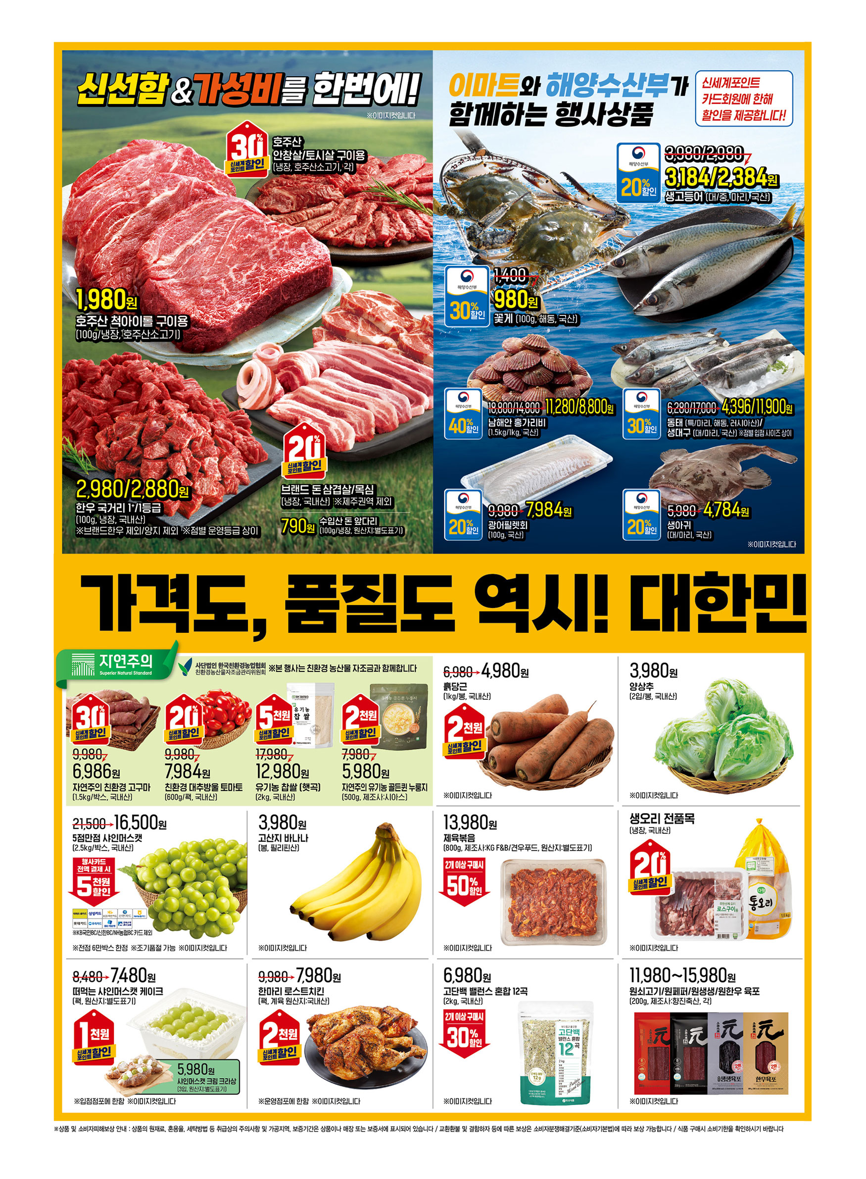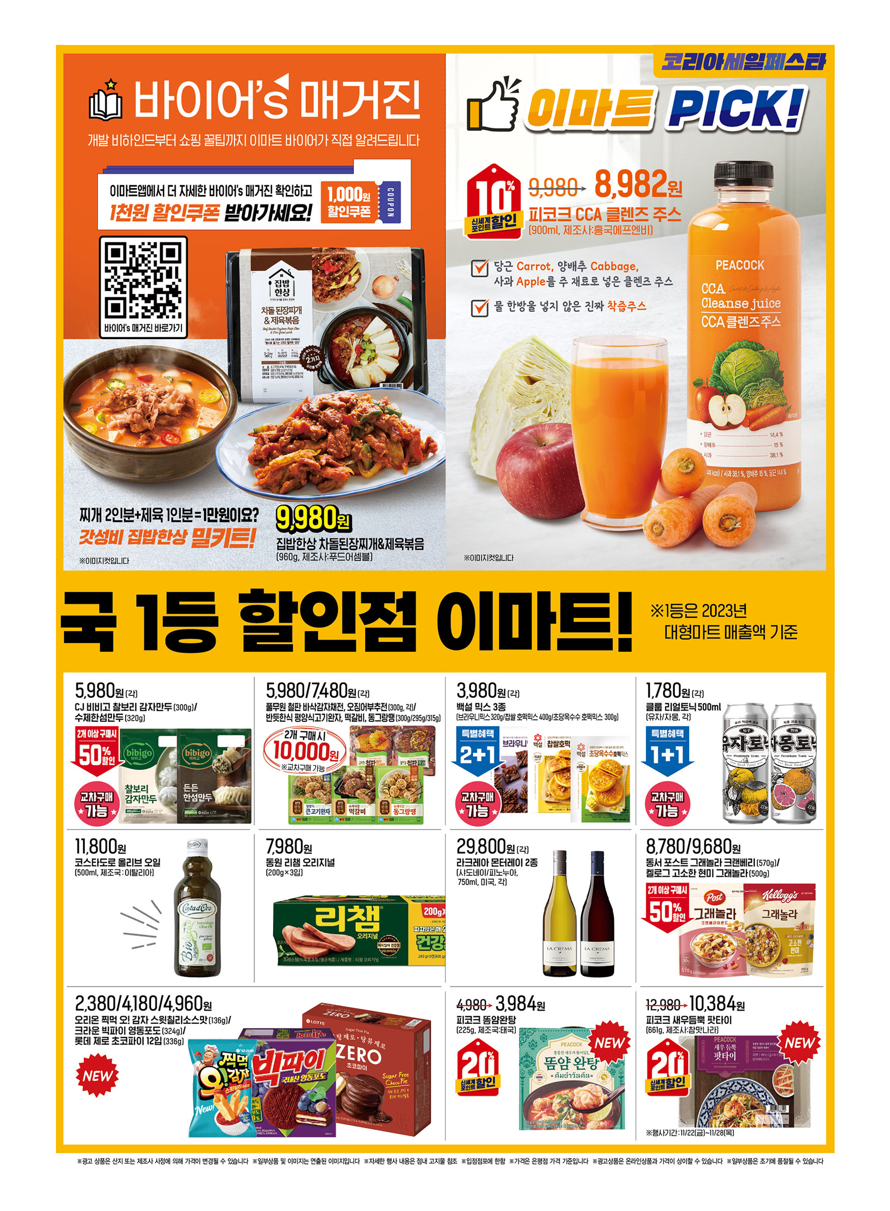 이마트가 11월 22일(금)부터 28일(목)까지 특별한 전단행사를 진행합니다. 이번 행사에서는 다양한 식품과 생활용품을 저렴한 가격에 만나볼 수 있는 기회가 가득합니다. 특히 코리아세일페스타와 연계되어 더욱 매력적인 할인가를 제공하니 꼭 확인해보세요!