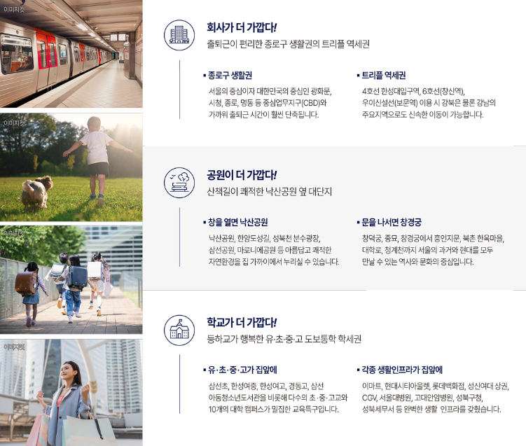 : 주요 지하철 노선 접근이 편리하며, 도심으로의 이동이 수월해 교통 여건이 뛰어납니다. 성신여대, 고려대 등 학군과 문화시설도 풍부하여 가족 단위 실거주에 적합합니다.