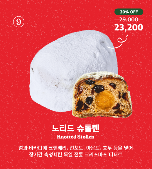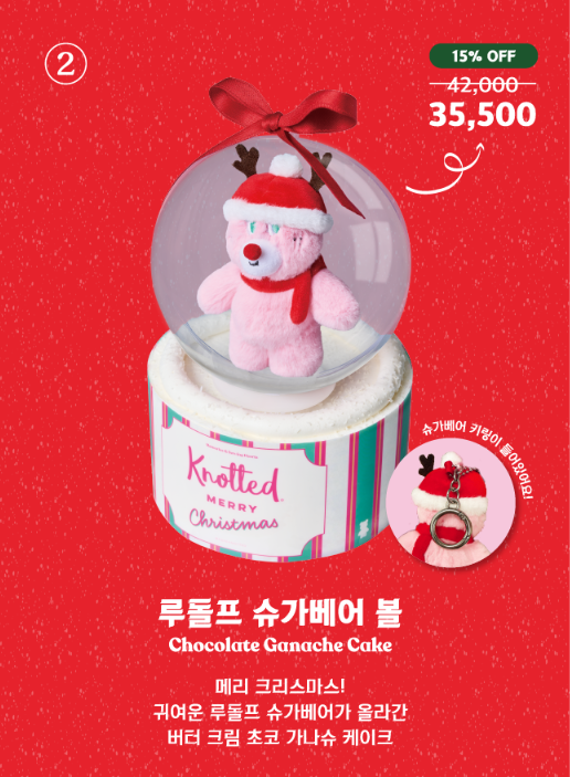 두 차례에 걸쳐 노티드 크리스마스 케이크 예약을 진행합니다. 1차 예약 시 최대 20% 할인, 2차 예약 시 최대 15% 할인을 제공합니다.