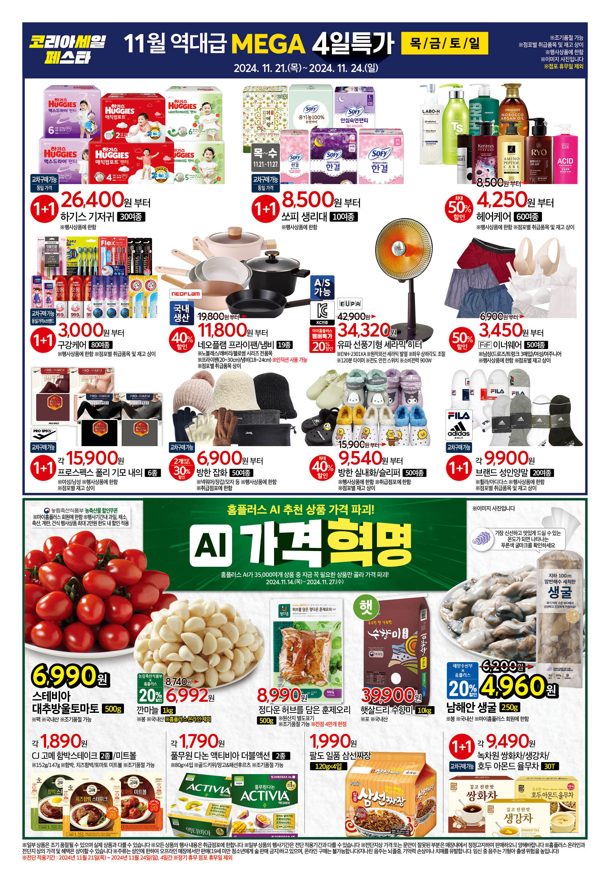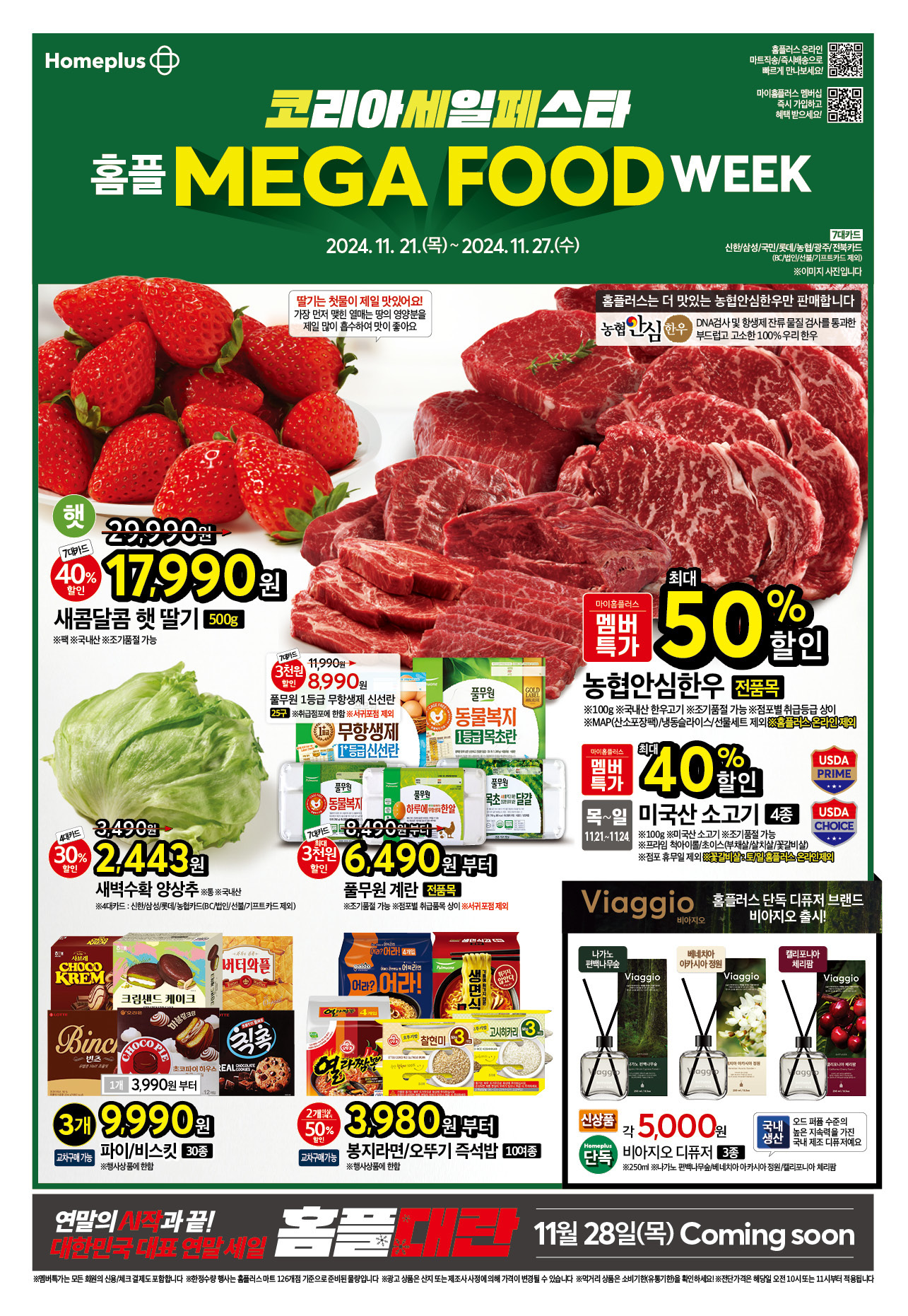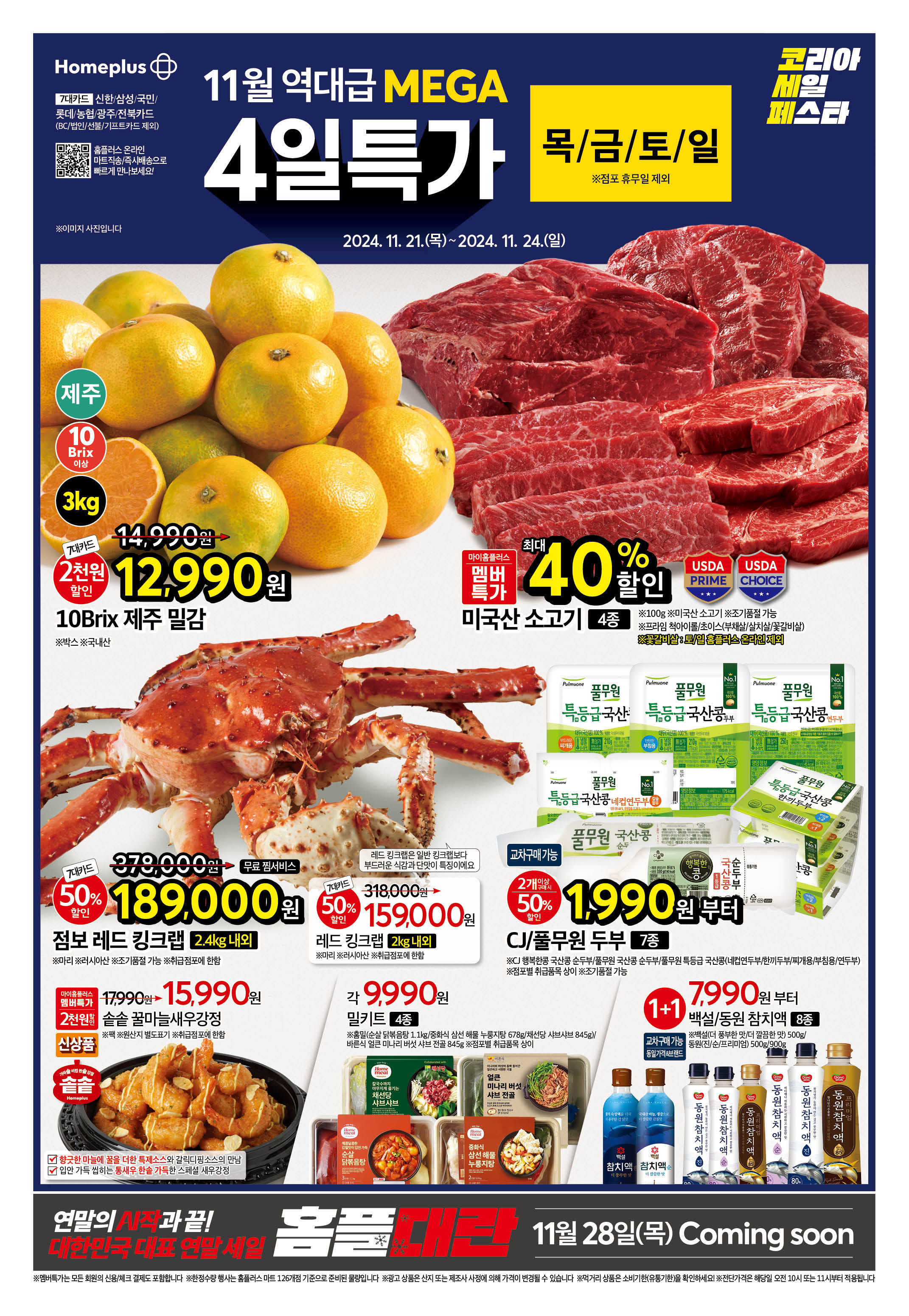 홈플러스는 매주 다양한 전단행사를 통해 알찬 할인 상품들을 제공하고 있어 자주 찾는 분들에게는 더없이 반가운 소식입니다. 특히, 11월에는 메가푸드위크 세일과 함께 풍성한 혜택이 쏟아지고 있어 더욱 만족스러운 쇼핑이 가능할 듯합니다. 이번 전단행사는 11월 21일(목요일)부터 11월 27일(수요일)까지 진행됩니다.