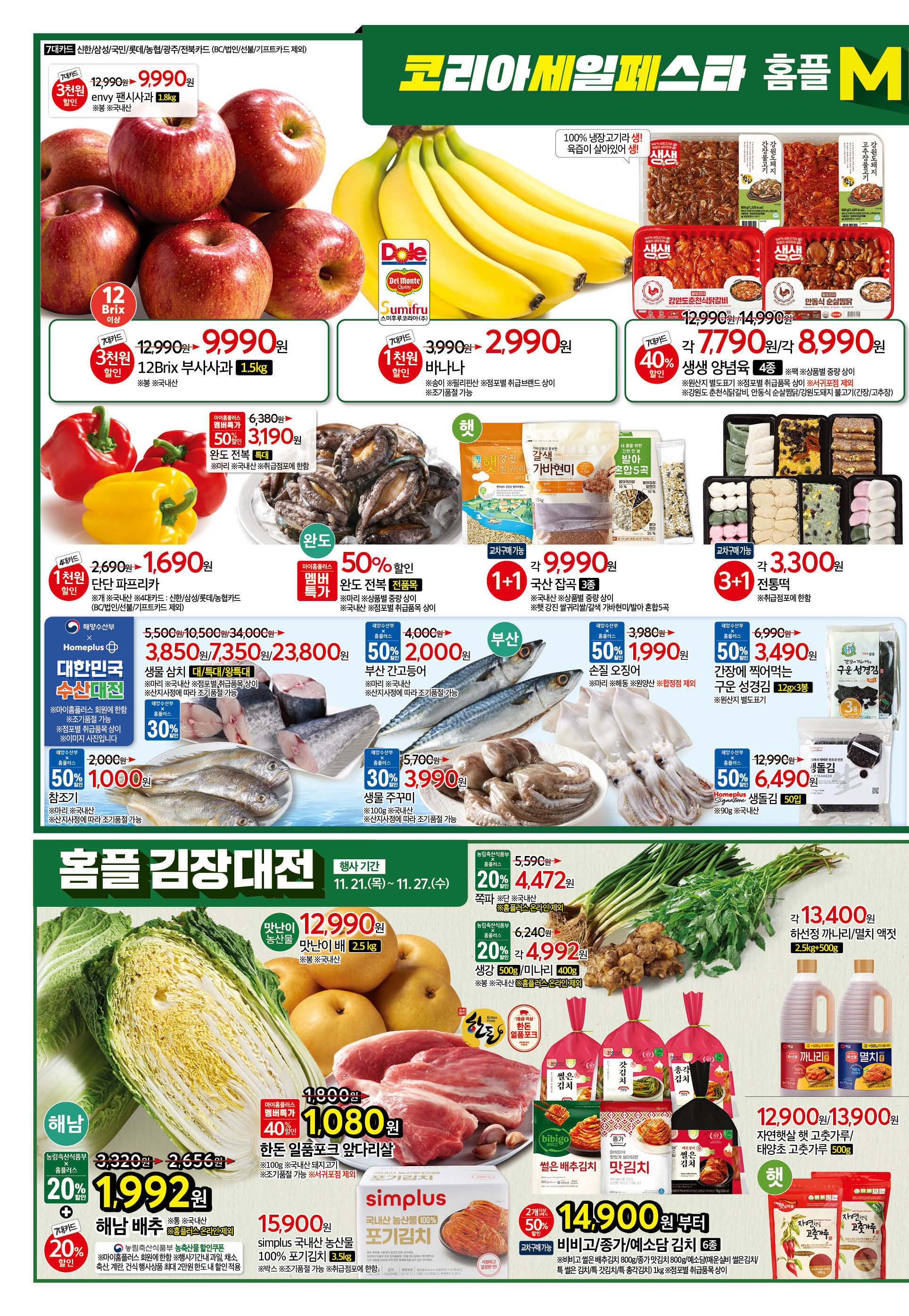 이번 주 홈플러스 전단행사는 다양한 품목에서 풍성한 할인 혜택이 가득한데요! 특히 김장 준비, 신선한 과일과 채소, 그리고 1+1 생활용품까지 알찬 구성이 돋보입니다.