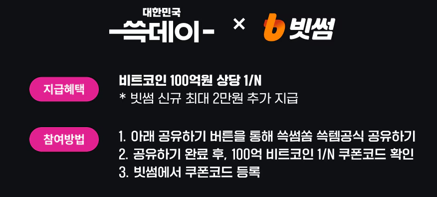 비트코인 100억 지급 이벤트가 주목받고 있습니다. 행사 폐막일인 11월 10일까지 쓱템 공식을 공유하면 100억원 상당의 비트코인을 받을 수 있는 기회가 주어지니, 꼭 참여해보시기 바랍니다.